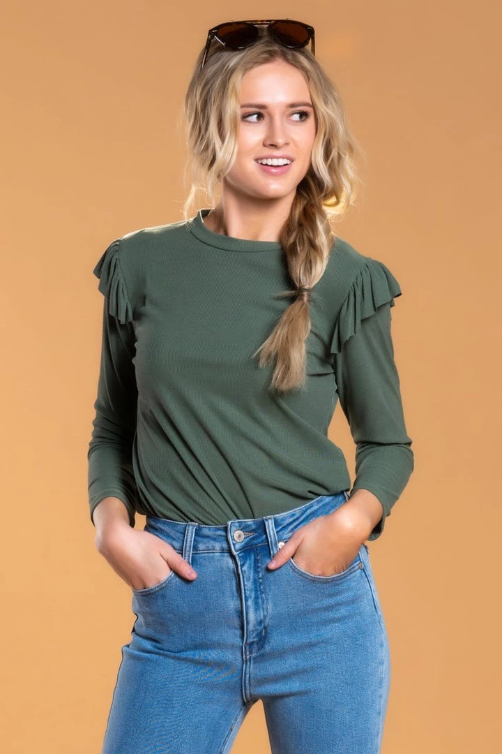Finished with ruffles on the shoulder, the Shoulder Ruffle Top adds a playful charm to your wardrobe. You won’t ever want to take this one off!