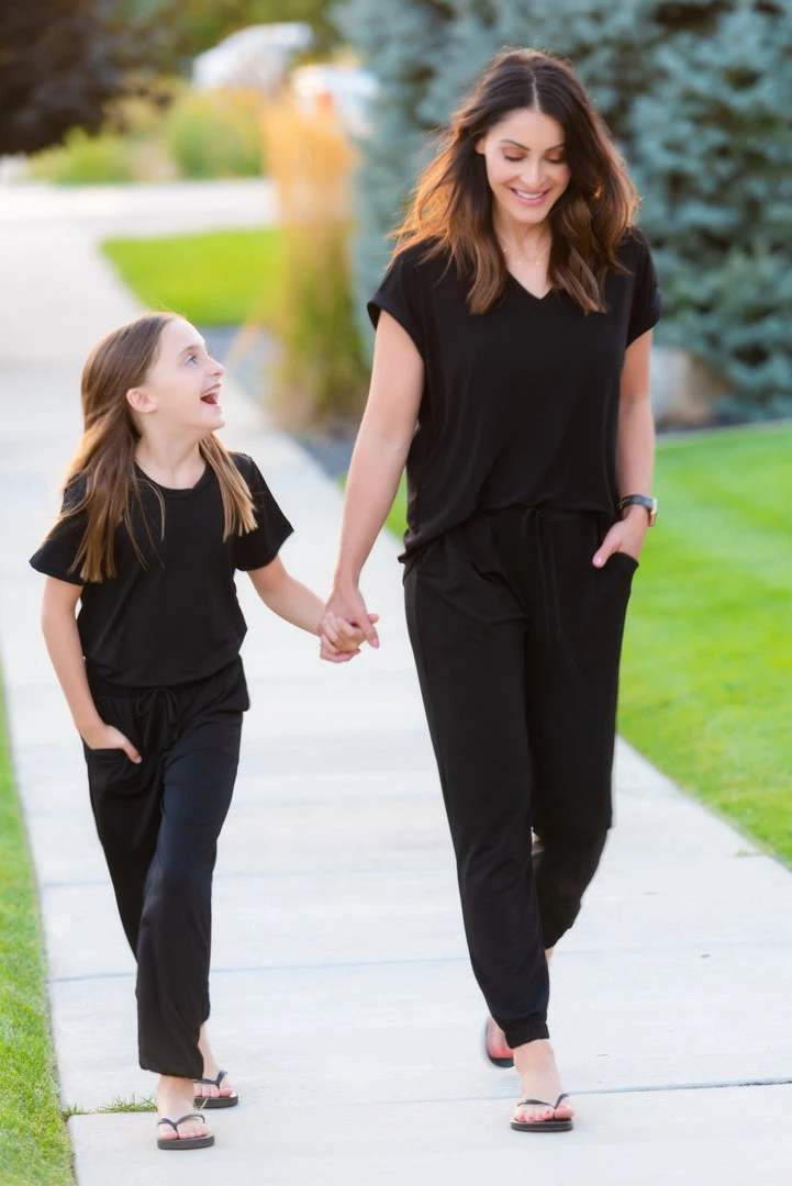 You love our Street Joggers! Kids do too! Featuring an elastic waist with a faux tie, cute elastic cuffs at the ankles, pockets, and are wrinkle free! Pair with the Kids Crew Neck Top for the cutest outfit!