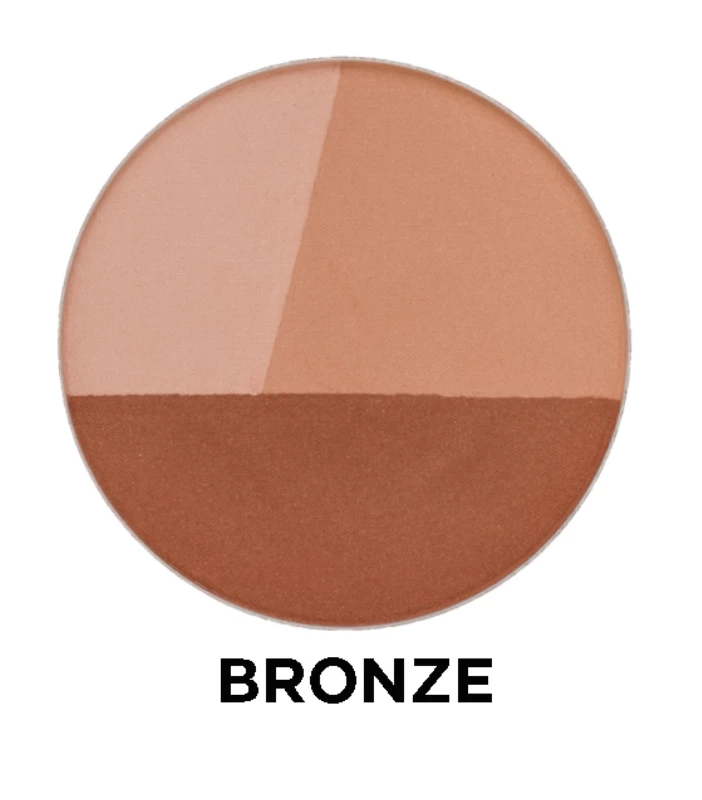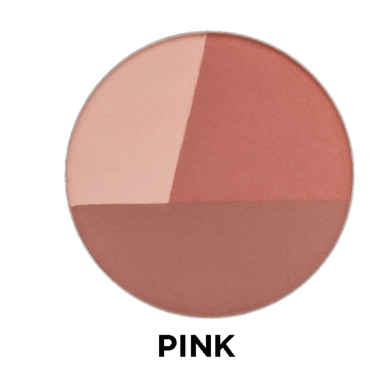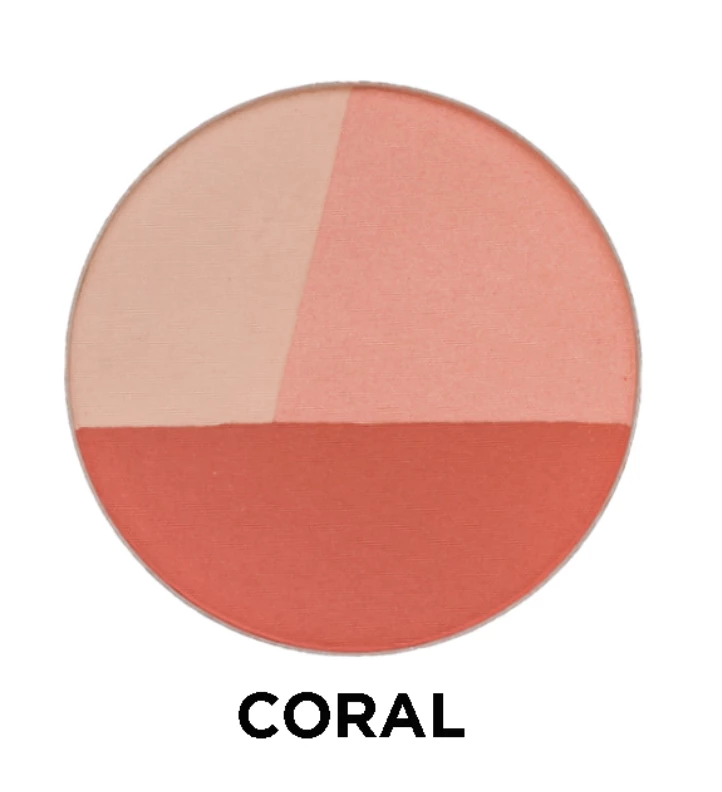 Apply the lightest shade to highlight, the medium shade on apple of cheeks as blush, and the deepest to contour. For quick application swirl all shades together with a fluffy brush and dust over cheeks to create the perfectly contoured cheek.