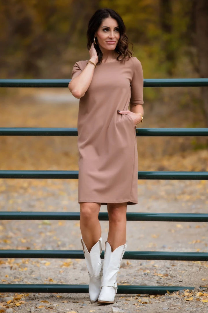 The Shift Dress brings together structure and sophistication. It features elbow length sleeves, a round neck and pockets. Classic and simple, yet gorgeous.