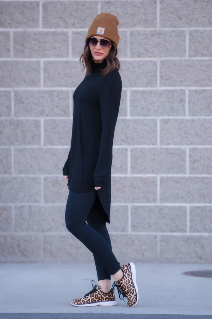 The warm turtleneck tunic in our butter soft jersey fabric that will keep you warm and long enough to cover your bum. Loose comfy fit. Perfect to pair with leggings or skinny jeans. Dress it up or down. Layer it or wear it alone. The perfect comfy tunic for busy moms to throw on and go.