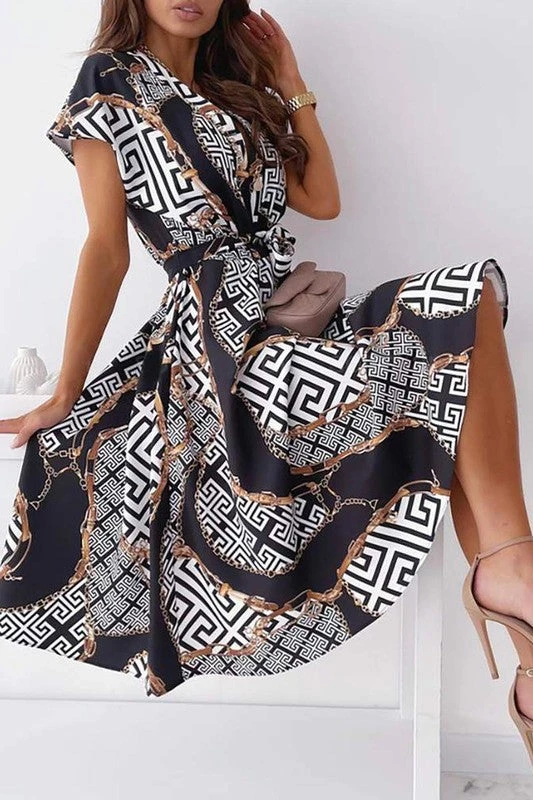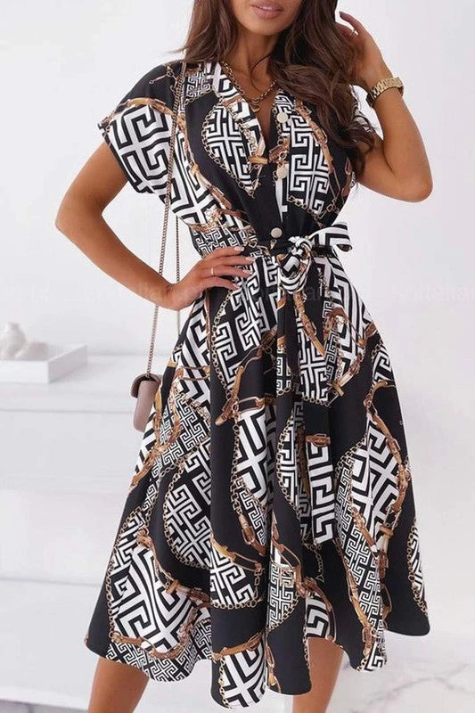 The Emily Midi Dress is darling. It has a lovely black and white pattern adorned with a tie belt, buttons, and a flattering v-neck.