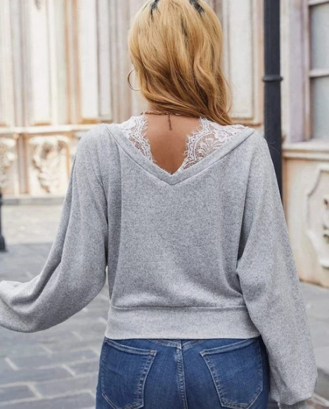 This sweater is detailed with gorgeous lace trim on the neck line of the front and back of the sweater.