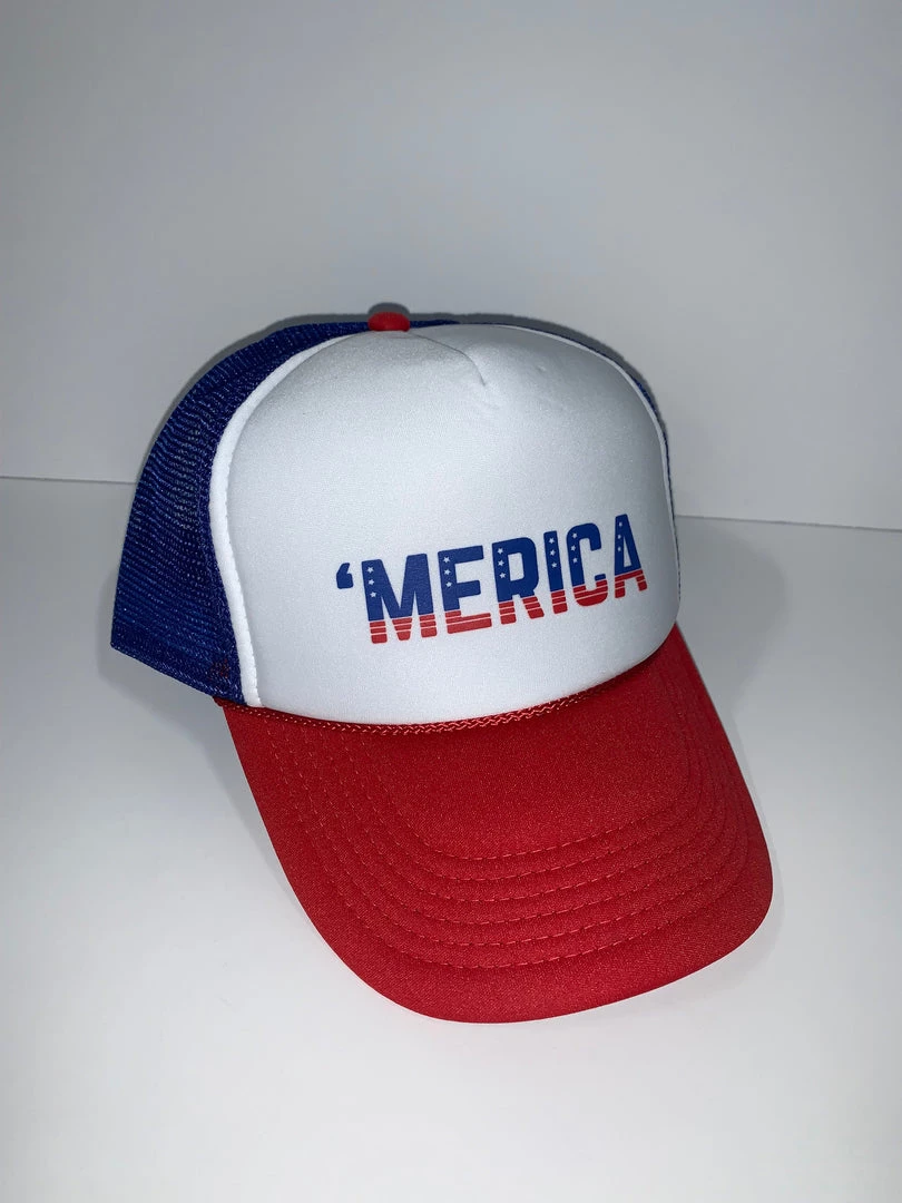 Merica 4th of July Hat. Cute baseball cap to celebrate the USA with classic red, white, and blue colors.