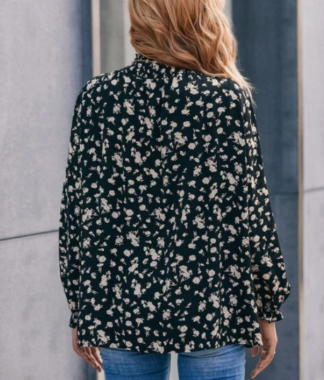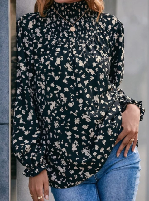This beautiful blouse is detailed with a vintage shirred high neck line.