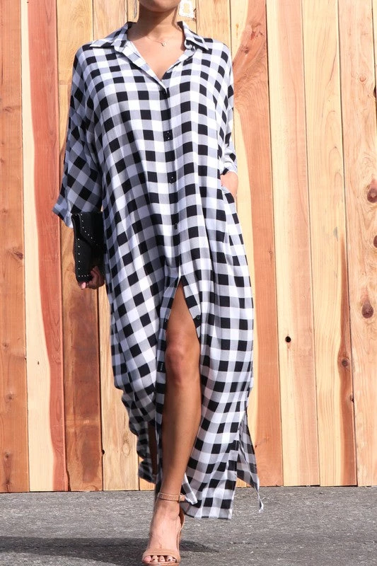 Lightweight Plaid woven long shirt dress with a relaxed fit, half sleeve & side pockets