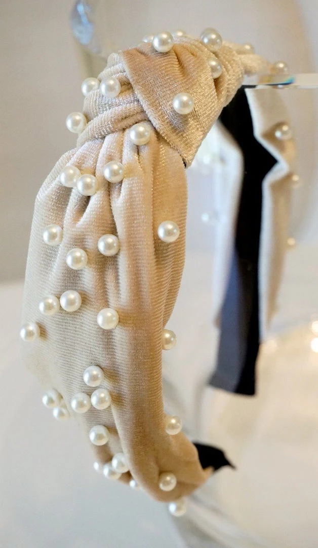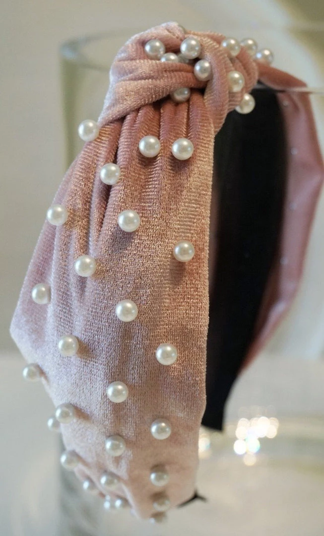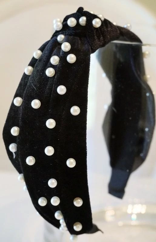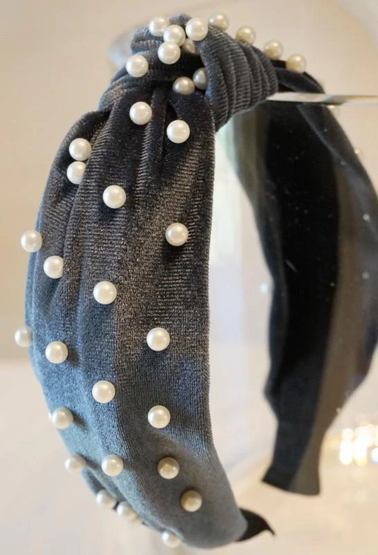 Velour headband with top knot and pearl accents.